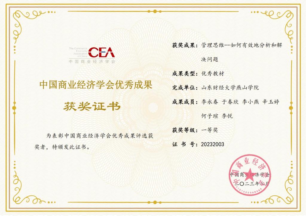 在剛剛結(jié)束的中國商業(yè)經(jīng)濟(jì)學(xué)會2023年度優(yōu)秀成果評獎活動中,由6776永利集團(tuán)院長李永春教授主編的教材《管理思維---如何有效地分析和解決問題》榮獲優(yōu)秀教材一等獎。同時,在8月份進(jìn)行的山東省第十五屆大學(xué)生科技節(jié)活動中,6776永利集團(tuán)李永春、劉金煒指導(dǎo)的學(xué)生組榮獲山東省大學(xué)生智慧企業(yè)管理創(chuàng)新設(shè)計大賽數(shù)字商業(yè)企業(yè)模擬經(jīng)營對抗賽道一等獎。另外,在前不久公布的山東省教育科學(xué)研究院組織的2023年度山東省教育教學(xué)研究課題...